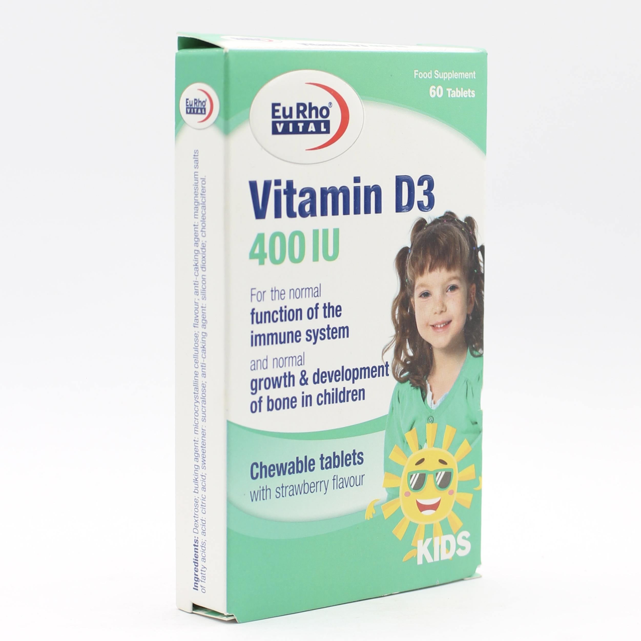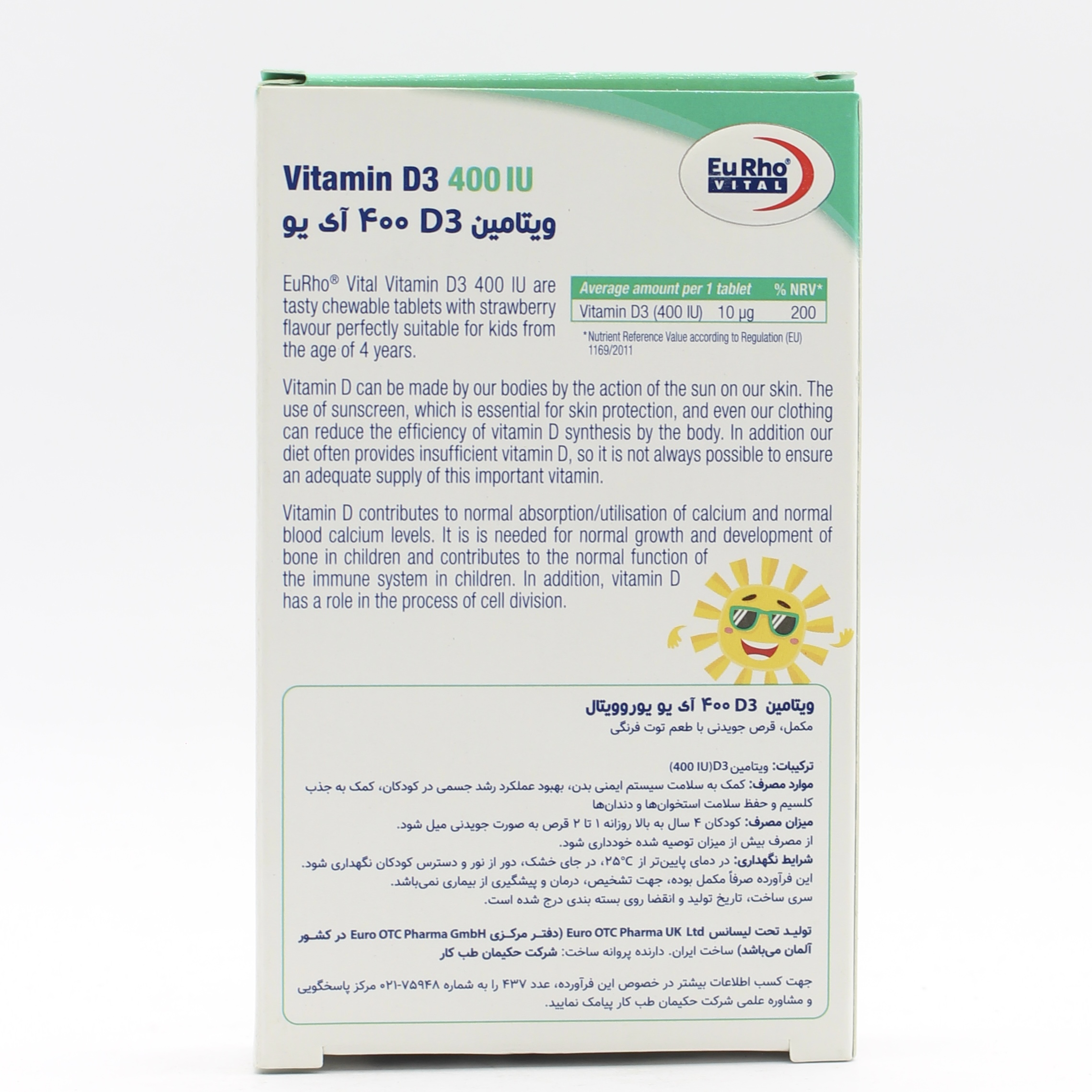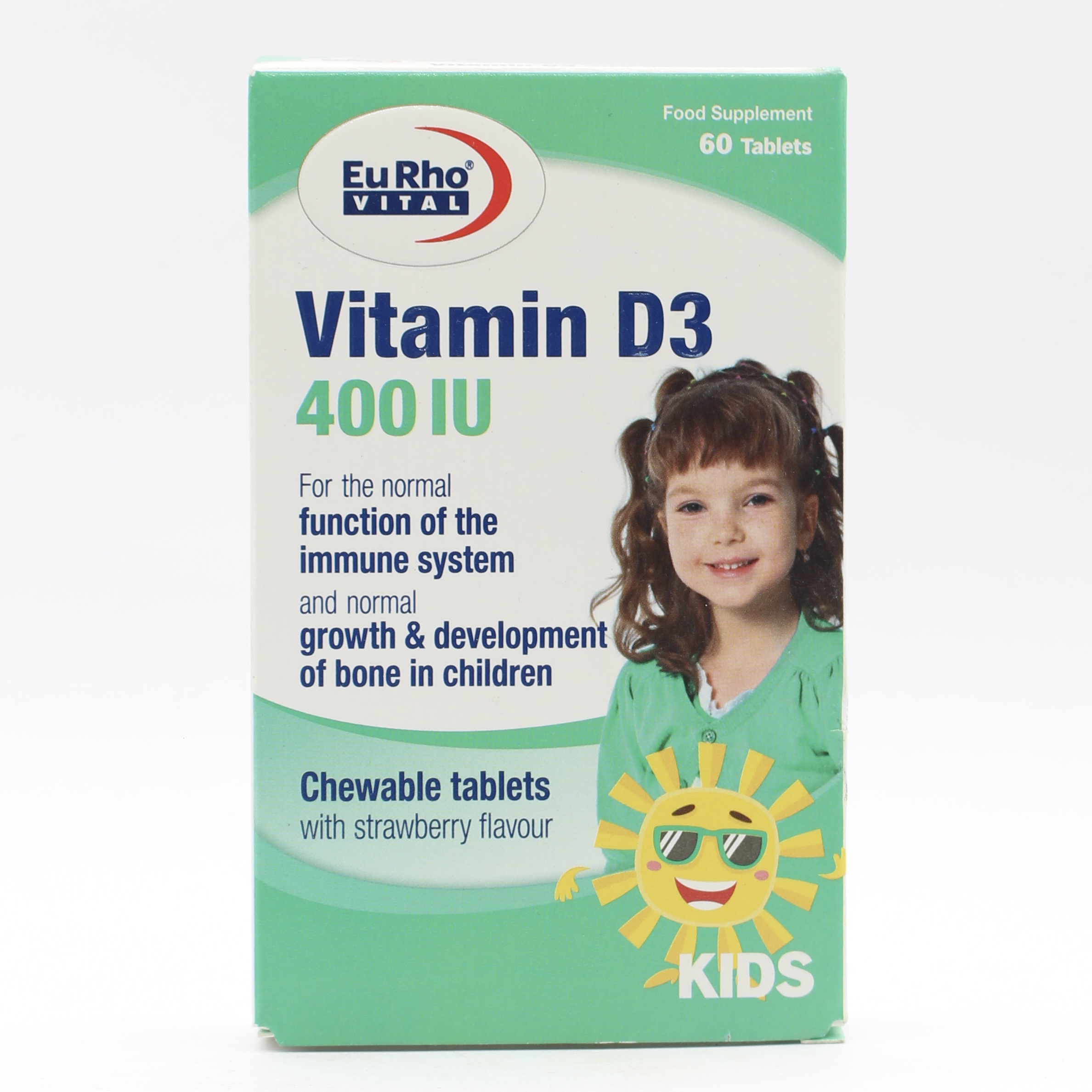 ویتامین D 400 یوروویتال یک مکمل غذایی جویدنی با طعم دلپذیر توتفرنگی است که به طور اختصاصی برای کودکان بالای ۴ سال طراحی شده. هر قرص از این مکمل حاوی ۴۰۰ واحد بینالمللی (IU) ویتامین D3 (کوله کلسیفرول) است که به عنوان یکی از مؤثرترین و قابل جذبترین انواع ویتامین D شناخته میشود. این مکمل به منظور حمایت از رشد و تکامل استخوانها، تقویت سیستم ایمنی و بهبود سلامت عمومی کودکان تولید شده است.