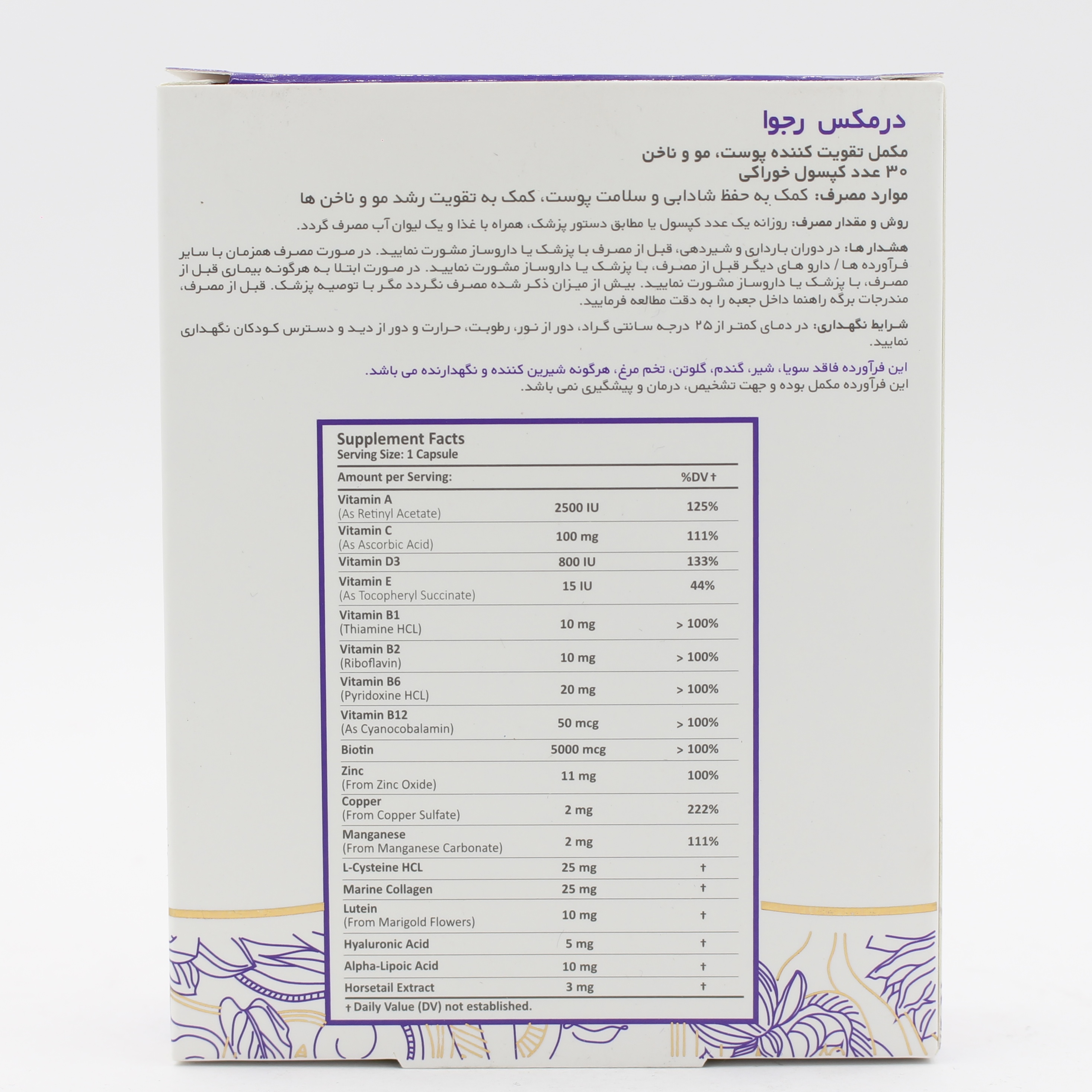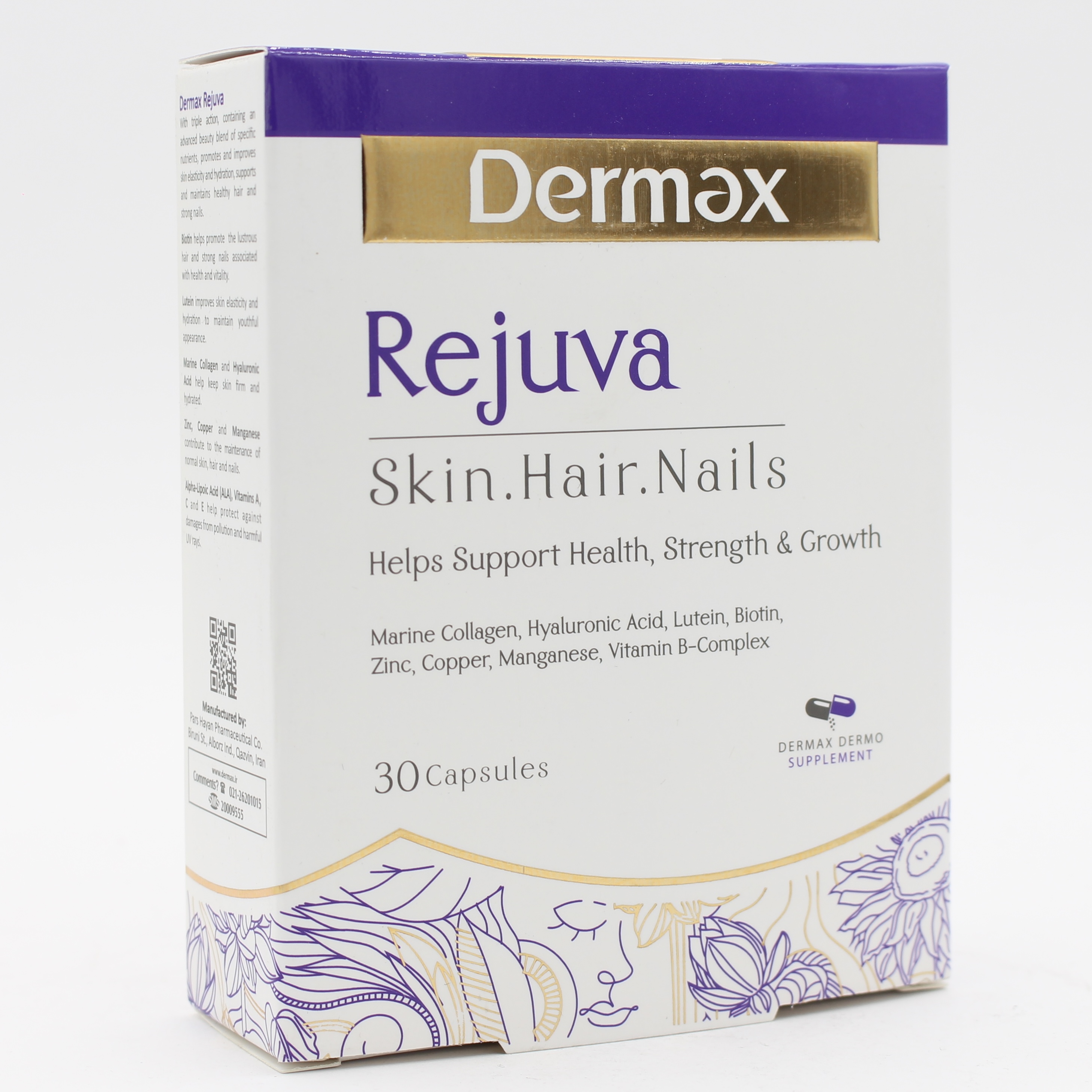قرص Rejuva به کمک ویتامینها و مواد معدنی ضروری، از جمله السیستئین و عصاره گیاه دم اسب، به حفظ سلامت پوست، مو و ناخنها کمک میکند. این مکمل با مقادیر کافی کلاژن دریایی، هیالورونیک اسید و لوتئین، از پیری پوست جلوگیری کرده و رطوبت و شادابی آن را حفظ میکند.