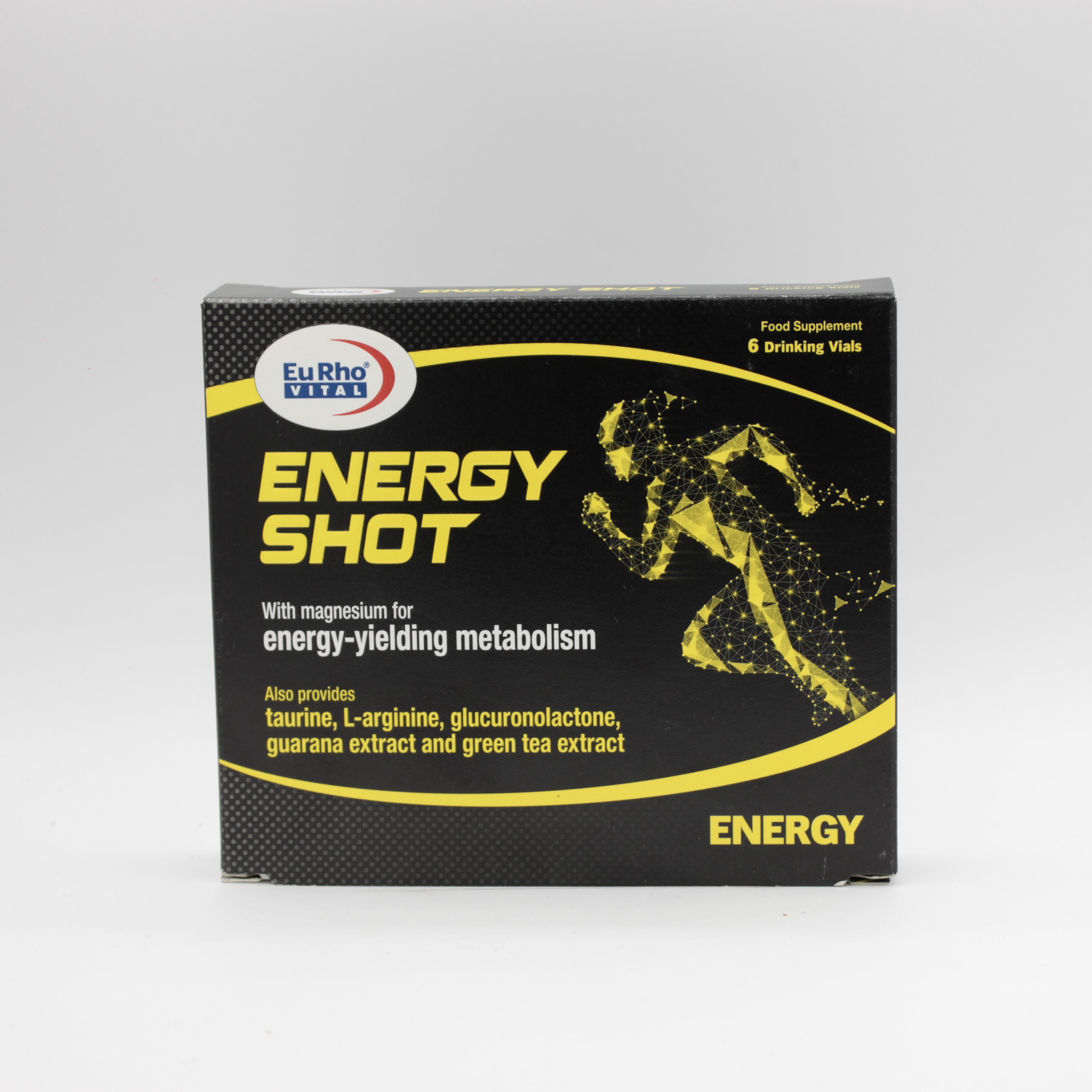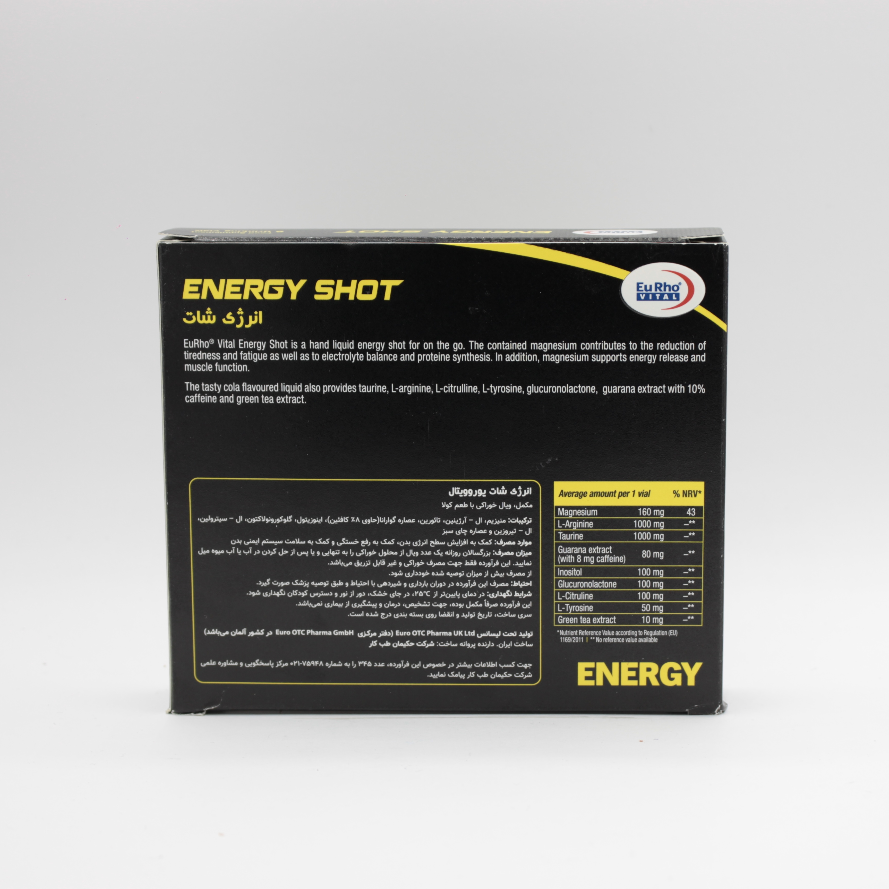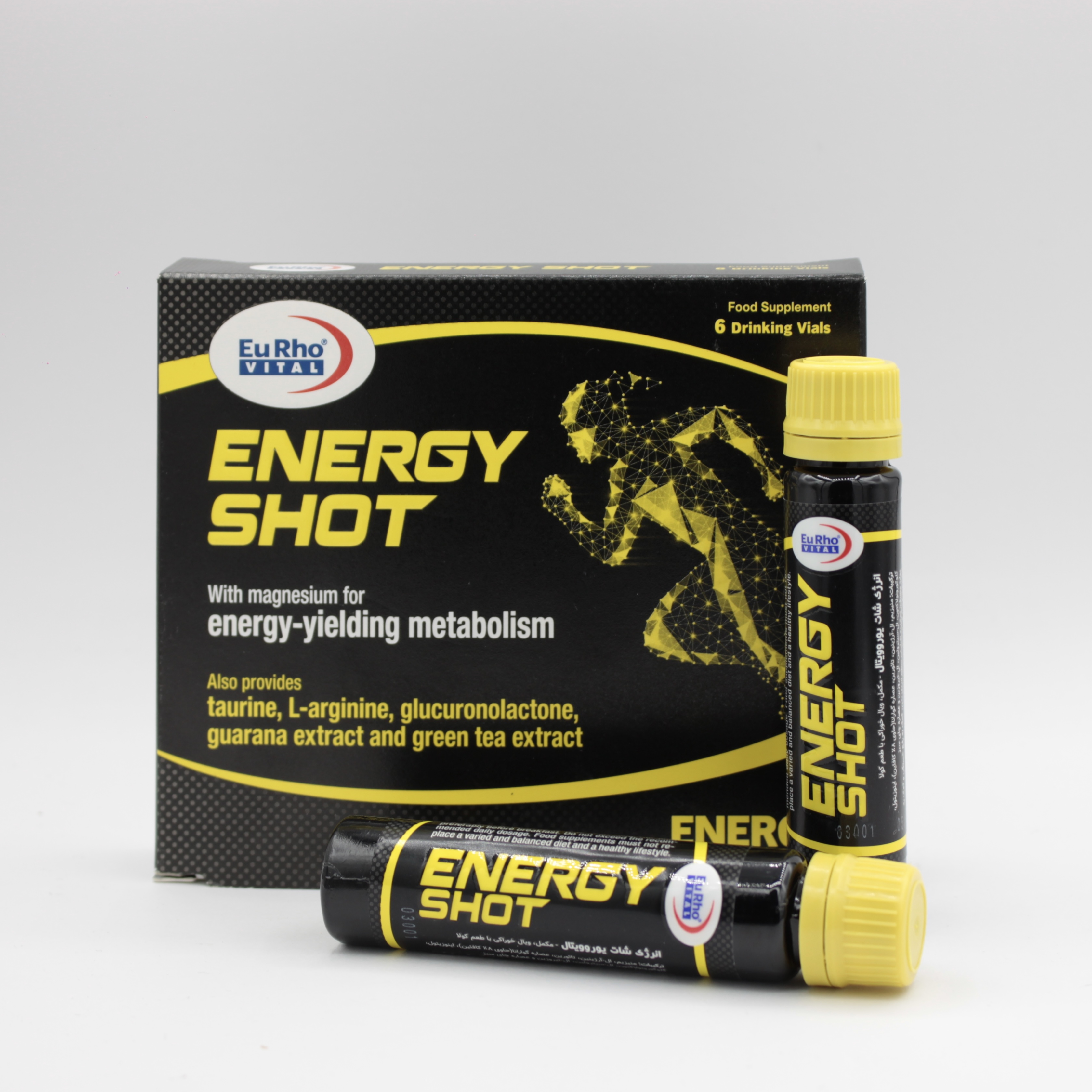 انرژی شات یک مکمل انرژی‌زا است که ترکیبی از مواد مؤثر همچون آرژنین، تائورین، سیترولین و عصاره چای سبز دارد. این مکمل در قالب ویال تولید شده است تا استفاده از آن برای مصرف‌کنندگان راحت‌تر باشد. انرژی شات یوروویتال برای بهبود عملکرد ورزشی و افزایش انرژی در حین تمرینات فیزیکی بسیار مؤثر است.این محصول حاوی عصاره گوارانا (که منبع طبیعی کافئین است) بوده و می‌تواند به افزایش چربی‌سوزی در کنار تمرینات ورزشی کمک کند. همچنین انرژی شات به بهبود خون‌رسانی به عضلات و کاهش خستگی بعد از تمرینات شدید کمک کرده و تسریع روند ریکاوری را به همراه دارد.ویال انرژی شات یوروویتال با طعم دلپذیر کولا عرضه می‌شود که استفاده از آن را لذت‌بخش می‌کند.