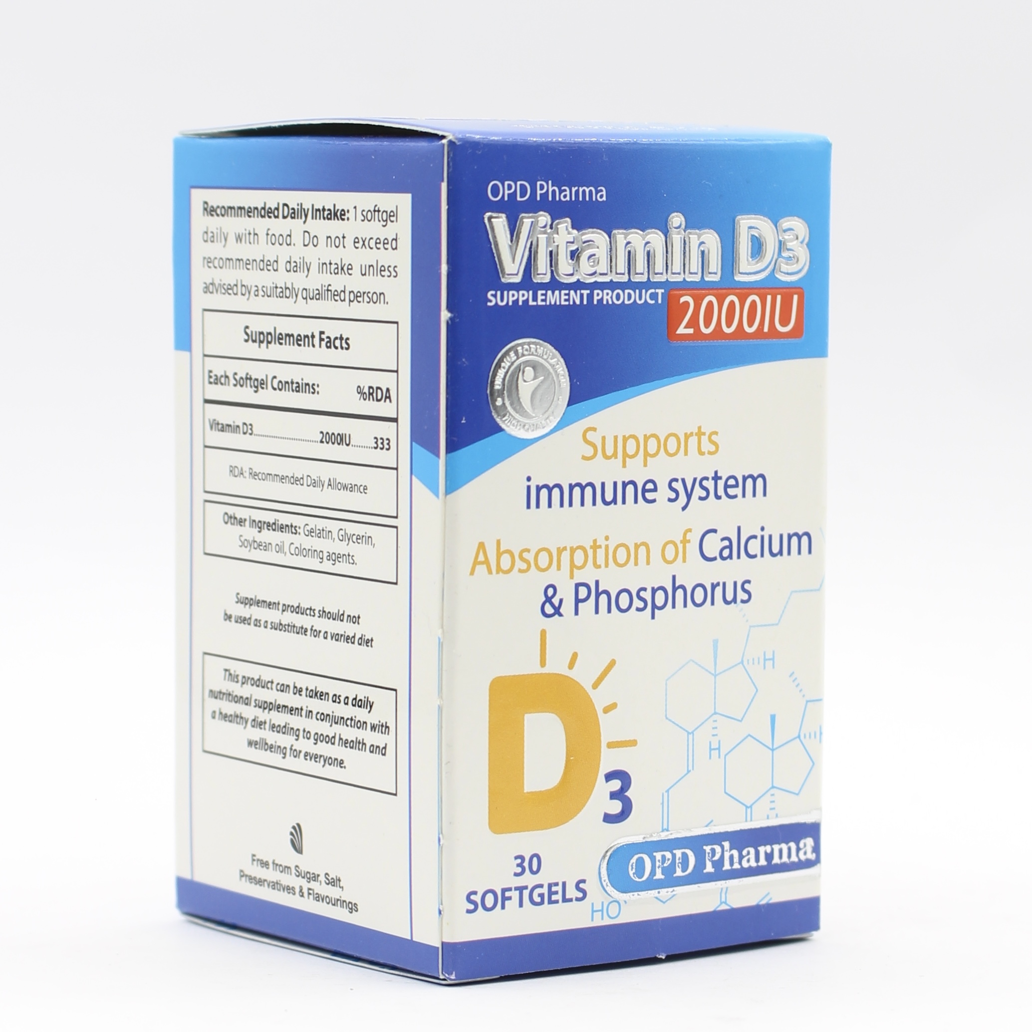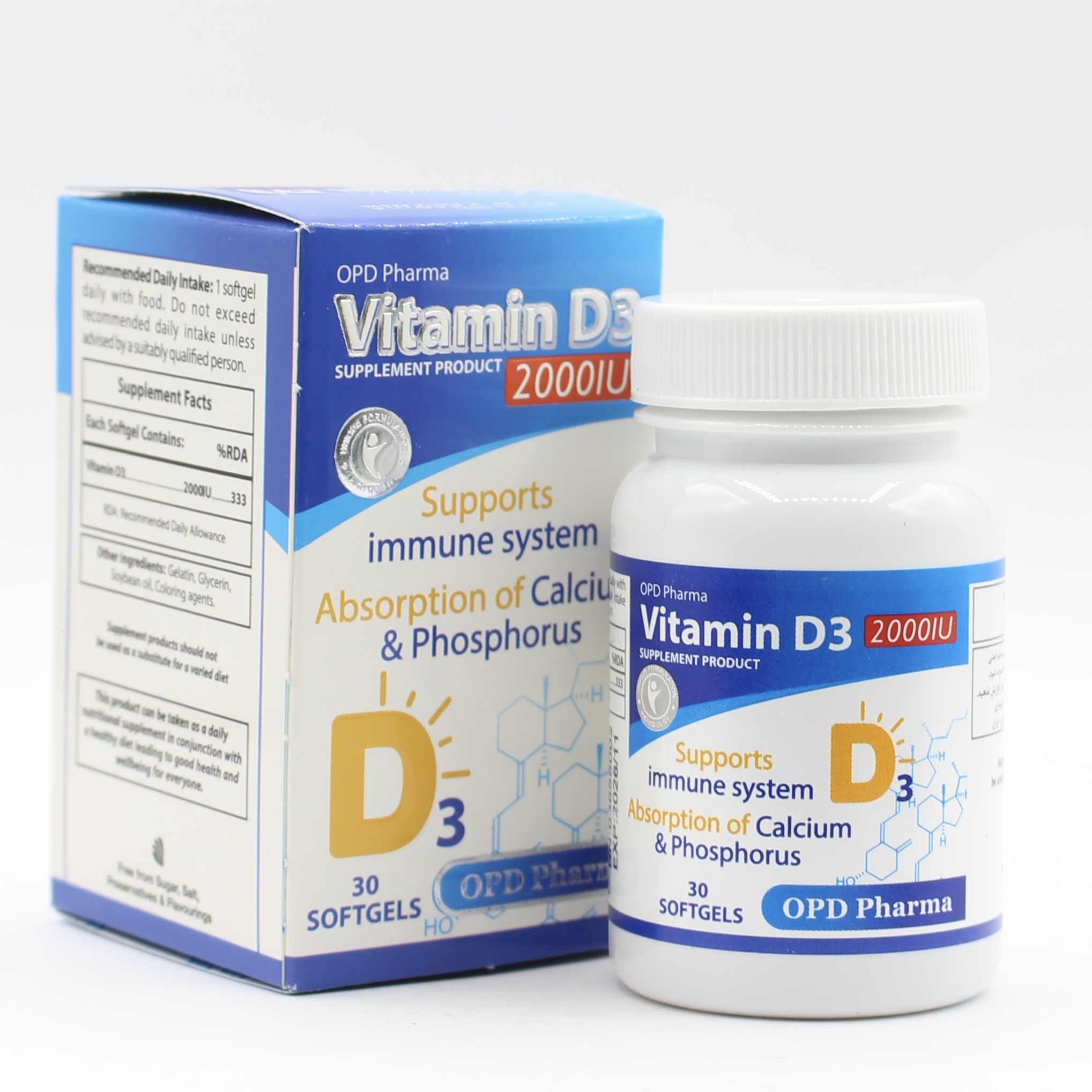 ویتامین D3 2000 او پی دی فارما یک مکمل قدرتمند است که برای تأمین نیاز روزانه بدن به ویتامین D3 طراحی شده است. امروزه، به دلیل سبک زندگی مدرن و استفاده از ضدآفتابها، بسیاری از افراد نمیتوانند ویتامین D کافی را از طریق نور خورشید دریافت کنند. این محصول به ویژه برای افراد مسن، کسانی که پوست تیره دارند یا در شیفت شب کار میکنند، توصیه میشود.