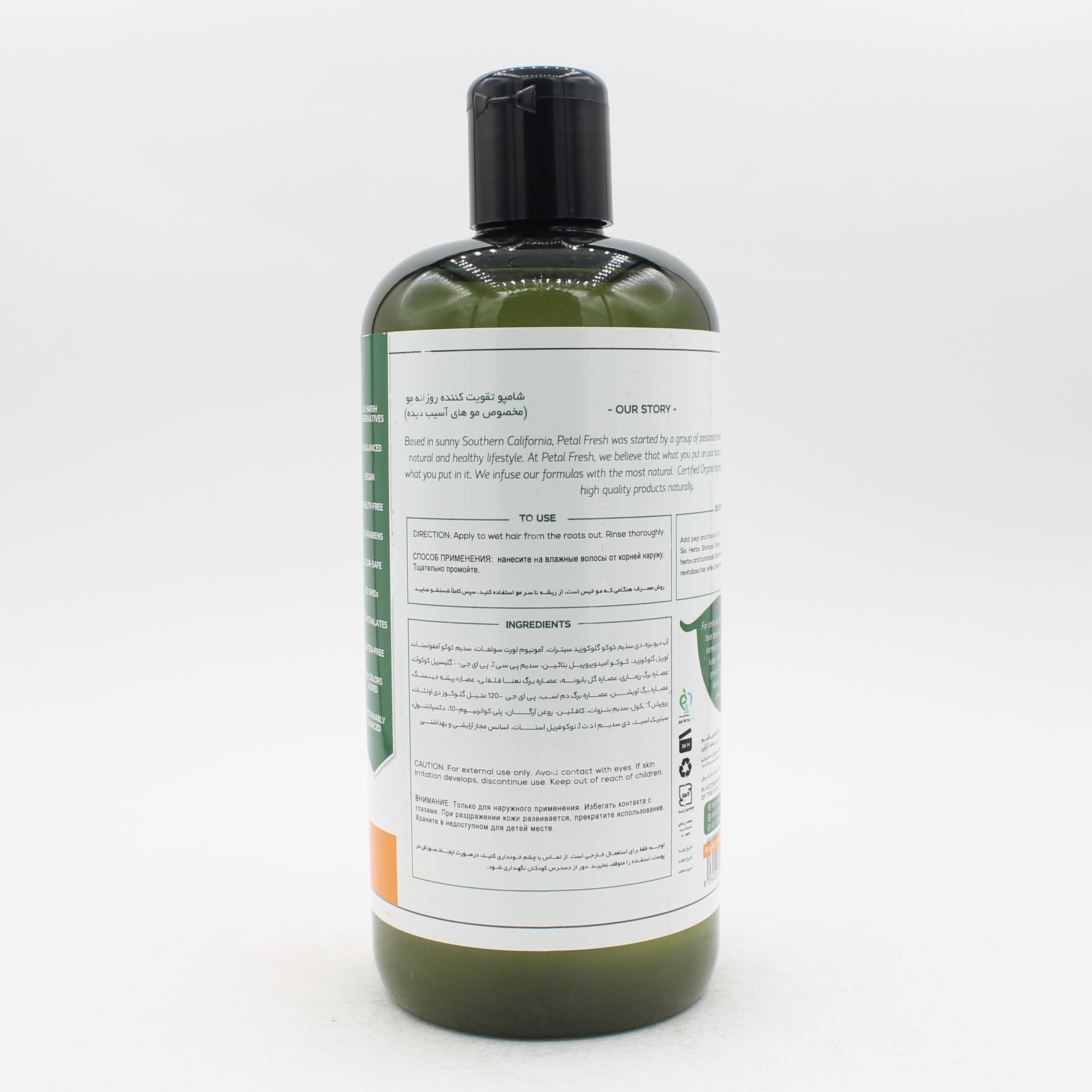فرمولاسیون ایمن: این شامپو کاملاً گیاهی بوده و فاقد پارابن و سایر ترکیبات شیمیایی مضر است، بنابراین برای انواع مو، حتی موهای حساس، مناسب است.